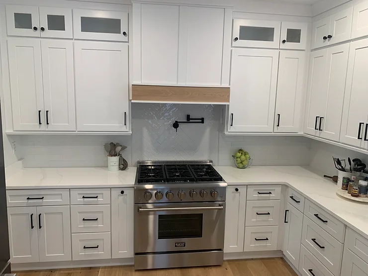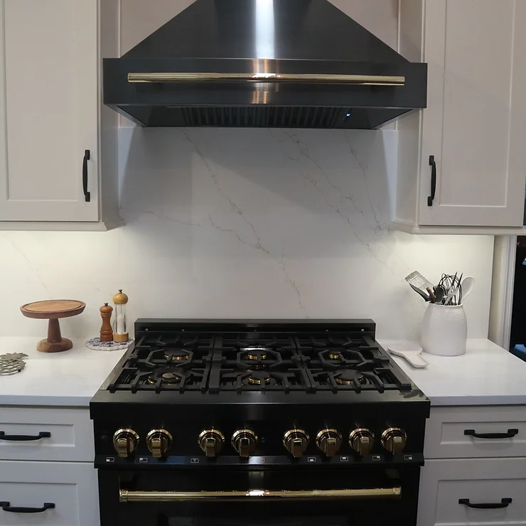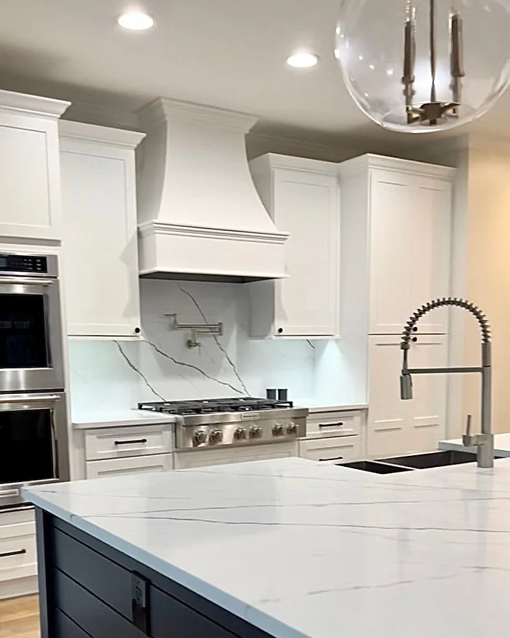 Countertops on either side of the range provide ample space for food prep, although we always maximize additional countertop space on the surround as well as via kitchen islands and peninsulas. Quartz is particularly suited for kitchen applications as it is durable and stain, scratch, and bacteria-resistant. Add tile over the range for an unexpected contrast in texture or opt for a matching quartz backsplash for a more modern, seamless look. Plus no grout lines means it’s easy to clean.