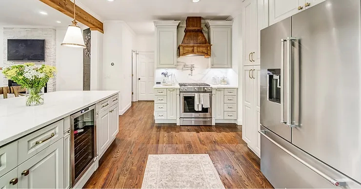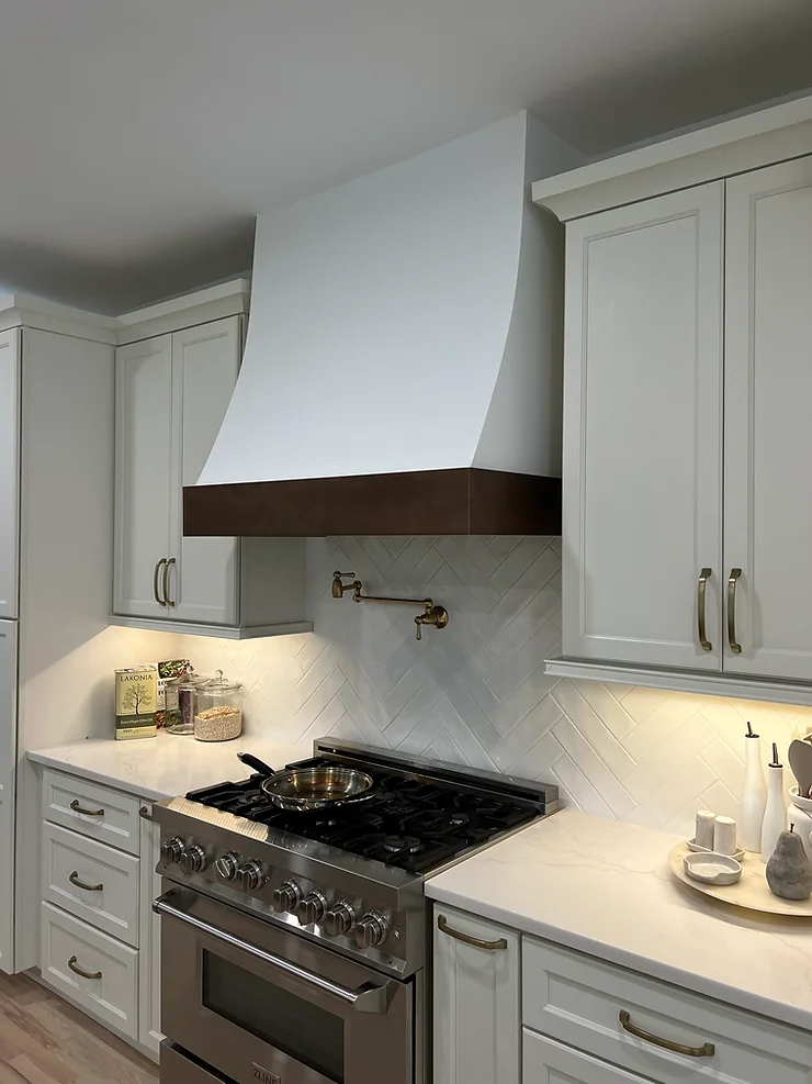 Add finishing touches that reflect other elements of your kitchen, pulling everything together for one cohesive look. Consider a chic and functional pot filler over the range and match the finish to your faucet and cabinet hardware. Match your hood vent to your appliances or add molding or accent trim to match the windows and cabinetry. You can even go for an all-wood look to emphasize your flooring and exposed beams.
