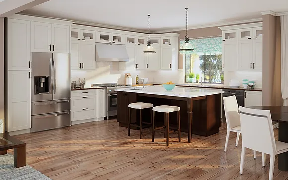 Shaker profile features a modern mortise and tenon door with a framed flat recessed panel.